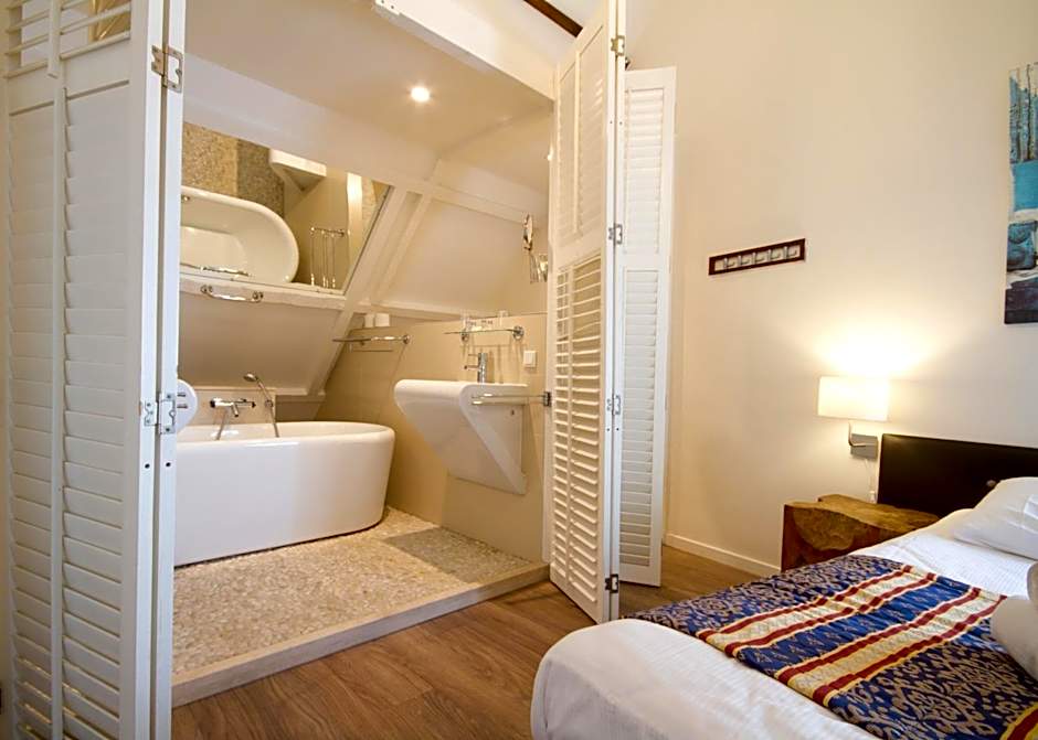 This room includes an Auping bed and flat-screen TV. The design bathroom is fitted with either a rain shower or a large bath.